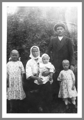 En genforenet familie >Borgerkrigen satte sit præg på det finske samfund i flere årtier efter 1918. Her ses en rød familie forenet efter krigen. Aaro Mömmö (født 1889, død 1939) med sin hustru og tre børn; Irja, Vienoi og Anna-Liisa. Billedet blev taget, da Aaro kom tilbage fra fangelejren. Han havde kæmpet i Kuopio og blev dømt til tvangsarbejde i Ortokumpo-minerne i 1918. Ukendt fotograf © The Finnish Labour Museum Werstas, Tampere