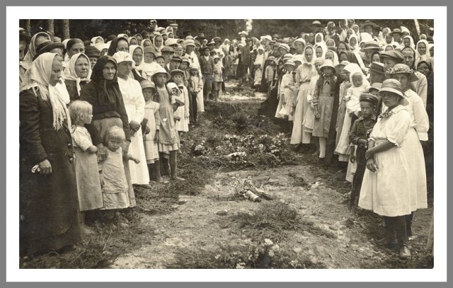 Sørgende ved faldne rødes grave i skoven 1919. Frygt og mistro gik dybt i samfundet efter krigen. Ifølge bladet Fattigvård (dansk: Fattigforsorg), var de rødes kvinder en stor trussel mod samfundet efter krigen. De blev fremstillet som rå uhyrer, der forgiftede deres børn med deres bitre had. I sådanne tilfælde anbefalede bladet at man tog deres børn fra dem. Ukendt fotograf © Folkets Arkiv, Helsinki