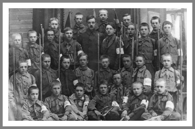 Drengespejder "Kivekkäät"-drengespejderne fra Kajaani, 1918. Under borgerkrigen tjente "Kivekkäät" som budbringere. Efter krigen blev mange af dem officerer i den finske hær, og de bar oplevelserne fra krigen videre. Officielt var spejderbevægelsen neutral under borgerkrigen. Der kæmpede imidlertid spejdere på begge sider. Efter krigen blev de mest forbundet med den hvide side. Ukendt fotograf © Krigsmuseet, Helsinki