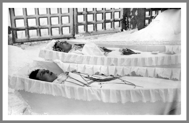 Lit de parade De hvide civilgardister Karl Ahti Tappura og Karl Eskild Adrian Polón beredt til deres begravelse på Kalevankangas-kirkegården. Ukendt fotograf © Vapriikki Photo Archives, Tampere