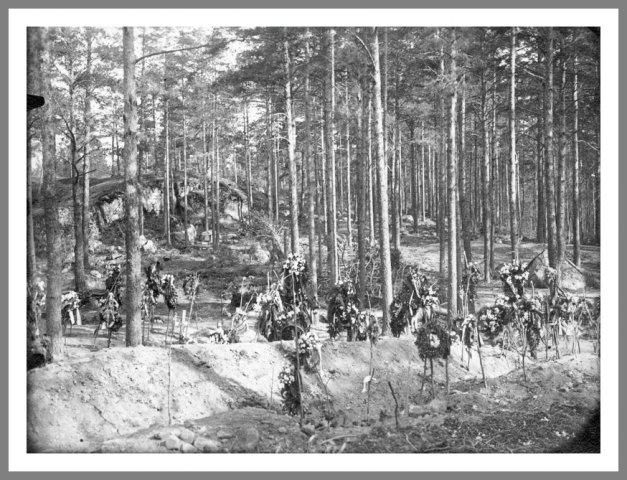 Kirkegård i Papula De rødes kirkegård i Papula, Viborg (Viipuri) var noget mere ydmyg end de hvides begravelsespladser og krigsmonumenter. Ukendt fotograf © Krigsmuseet, Helsinki