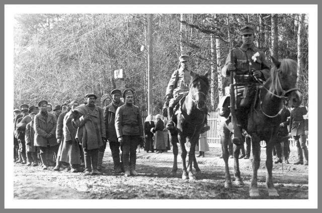 Fangne russere i Terijoki Fangne russere i Terijoki. I årene efter 1918 brugte de hvide russernes tilstedeværelse til at retfærdiggøre krigen som en frihedskrig imod en ydre undertrykker. De senere års historieforskning har dog påvist, at russerne indtog en mere tilbageholdende position i konflikten end tidligere antaget. Ukendt fotograf © Vapriikki Photo Archives, Tampere