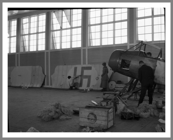 I marts 1918 fløj svenskeren Eric von Rosen, med piloten Nils Kindberg, sit Thulin type D-fly til Vaasa for at støtte de hvide styrker. Det var det første fly i den finske luftstyrke. De røde havde dog allerede anvendt russiske fly og piloter. På dette billede bliver vingerne på von Rosens fly dekoreret i hangaren i Umeå, Sverige før starten. Det finske luftvåben brugte det blå hagekors indtil 1945.