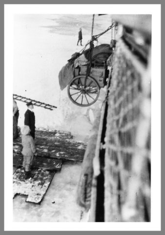 En køkkenvogn tømmes ved svenskernes landgang på Ålandsøerne midt i april 1918.