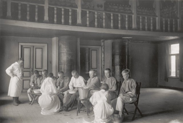 Fra Enso Työväentalo (dvs. Arbejderföreningen hus i Enso). Overlæge Chievitz inspicerer