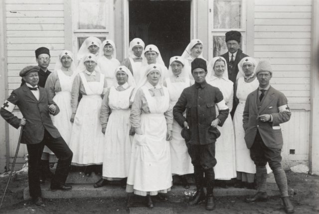 Den danske Finlandsambulances repræsentanter samlet i Mänttä. Ambulancen fungerede i byen marts-april 1918 under kampene om Tampere. I forreste række med mørkt tøj, hue og hænderne i siden ses dr. Ole Chievitz, ekspeditionens leder. Chievitz' sympati for Finland var livslang. Yderst tv. med stok dr. Hindsberg.