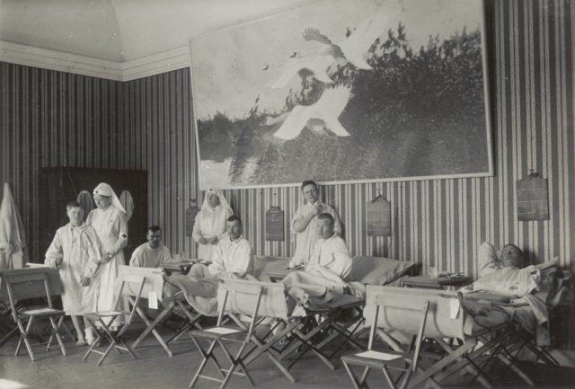 Fra lazarettet på Mänttä. Sårede hvide ligger under maleri af den svenske kunstner Bruno Liljefors. De to sygeplejersker er Charlotte la Cour, og oversygeplejerske fru Frida Køster, manden stående i midten er reservelæge Hindsberg. Fru Køster, der var finskfødt, sendte under opholdet regelmæssige artikler til Næstved Tidende.