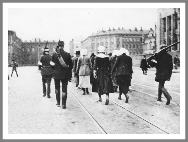 Kvindelige rødgardister holder øvelse i Uuras, Viborg (Viipuri). Op mod 3000 kvinder tjente som soldater i Den Røde Garde. De bar bukser og samme udrustning som mændene. De bevæbnede kvindegrupper kunne bestå af alt fra nogle få banevagter til Helsingfors' såkaldte "Dødsbataljon", som bestod af 466 kvinder, da den blev grundlagt.