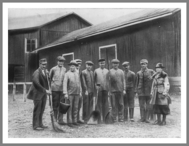 Fra Enso Työväentalo (dvs. Arbejderföreningen hus i Enso). Overlæge Chievitz inspicerer