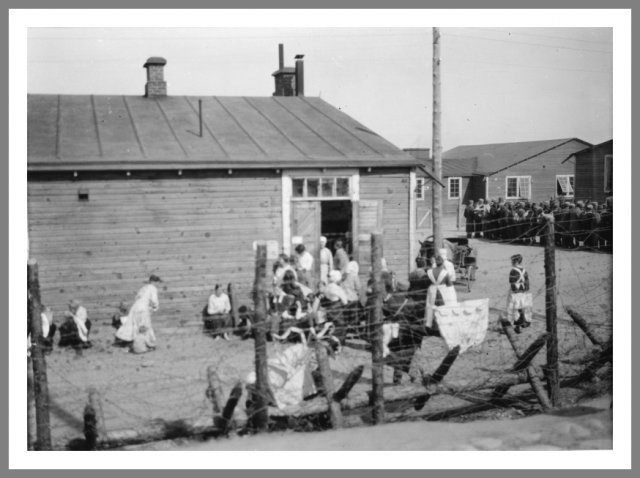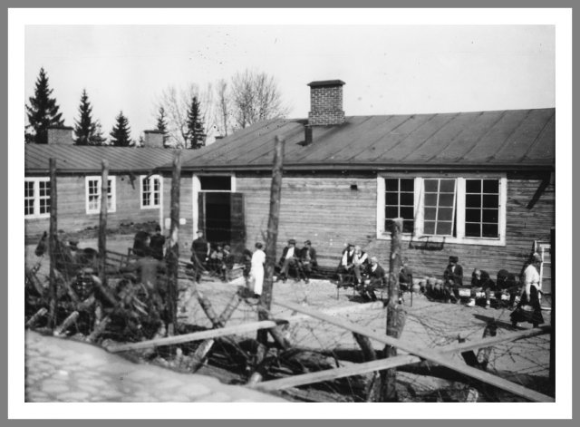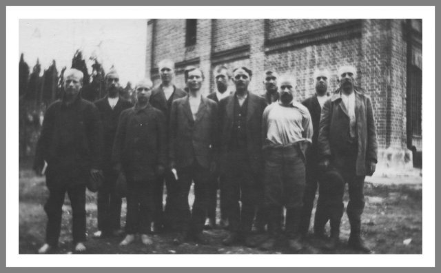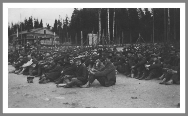 Fanger siddende ved barakkerne ved fangelejren i Riihimäki, 1918.