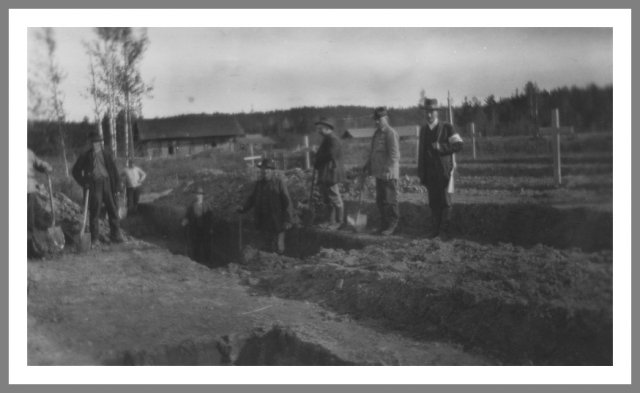 Massegrave ved Riihimäki-fangelejren 1918. Fanger med skovle, samt vagter.