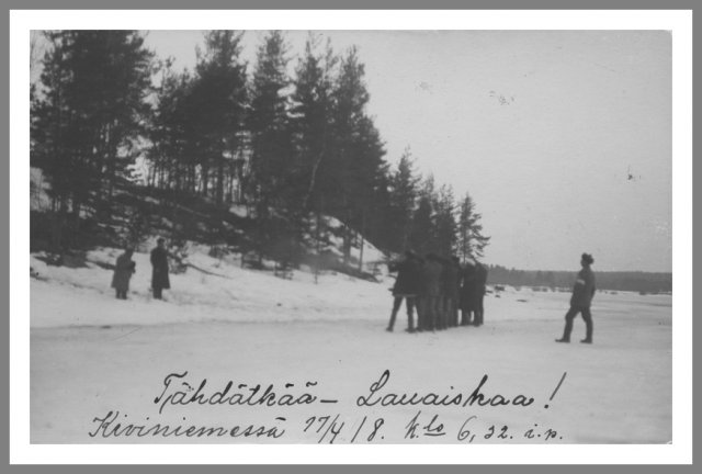 Ved frontlinjen på det Karelske Næs i landsbyen Kiviniemi i Sakkola: de hvide henretter to rødgardister på kysten ved Suvanto 13. april 1918, kl. 18.32.