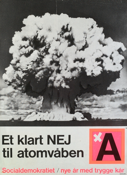 Danmark blev også ”allieret med forbehold” i forsvarspolitisk sammenhæng. Plakaten er fra folketingsvalget 1964, hvor vi officielt gik imod atomvåben på dansk jord. Alligevel havde USA stiltiende fået tilladelse til at opstille atomare våben i Grønland.