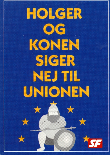 Holger K. Nielsen var formand for SF, da Danmark skulle til folkeafstemning om Maastricht-traktaten 1992. En fiffig partifælle opfandt det mundrette slogan ”Holger og konen siger nej til unionen” og plakaten blev straks folkeeje. I dag udtrykker den hele uenigheden blandt politikere og befolkning om hvorvidt et tættere EU-samarbejde grundlæggende var godt eller dårligt for landet – nej, ja og ”fire forbehold”.