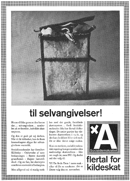 Folketingsvalget i 1966 blev også kaldt ”Kildeskattevalget”. En gennemgribende skattereform blev efterfølgende gennemført i foråret 1967 og igangsat fra 1969/70. Det blev ikke valgets store tema, der gjorde den lille plakat så berømt, men en veltilrettelagt aviskampagne. At føre valgkamp med en gammel skraldespand som blikfang var dristigt, og plakaten står stadig klart i folks erindring.
