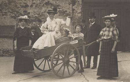 Den første Børnehjælpsdag i Århus. Peter Sabroe kører trækvognen mens en borgerfrue styrer indsamlingsbøssen.Program: