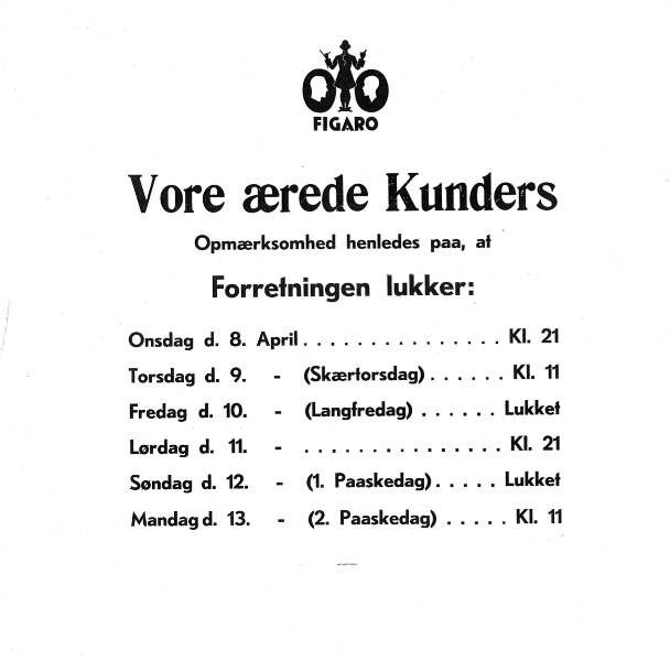 Af Dorte Ellesøe Hansen Et udpluk af gamle plakater med forslag til en aktiv påske: I 1936 var det muligt at blive barberet og klippet både skærtorsdag og 2. påskedag. Man skulle tidligt op, for der blev lukket kl. 11 om formiddagen. I 1927 havde frisørmestrene iværksat en stor lockout og svendene havde oprettet et netværk af egne virksomheder under det fælles navn Figaro-Saloner. Arbejdernes eget bryggeri ”Stjernen” solgte denne ”skattefri” påskeøl formodentlig i 1930’erne. Det var nok en hvidtøl, for der kom en rigtig påskebryg på markedet i 1934. Skærtorsdag i 1966 indkaldte Kampagnen mod Atomvåben til demonstration ved den tyske ambassade for at protestere mod vesttyske kernevåben. Kampagnen arrangerede ikke længere atommarcher herhjemme, men flere hundrede danskere tog 1. påskedag over grænsen og støttede de samtidige vesttyske marcher.