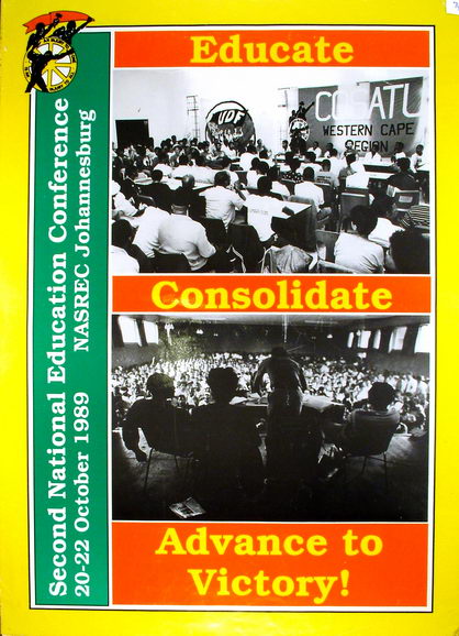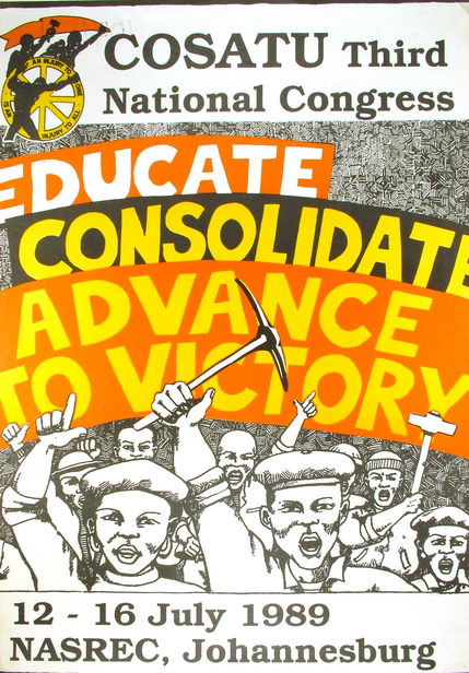 Fra projektets plakatsamlinger er her udvalg dels plakater fra fagbevægelsen, dels fra anti-apartheidbevægelserne. Den sydafrikanske fagbevægelse, Congress of South African Trade Union (COSATU) blev grundlagt i december 1985. Det skete efter fire års drøftelser mellem fagforeninger, der var engageret i kampen mod apartheid og som ønskede at skabe et ikke-racedelt, ikke-kønsdelt og demokratisk Sydafrika. På stiftelsestidpunktet repræsentede organisationen 1/2 million arbejdere fra 33 fagforeninger. Siden er medlemstallet steget til over 2 millioner og mens de fleste fagforeninger- herunder som bekendt i Danmark - mister medlemmer, stiger COSATUs medlemstal fortsat. Nedenfor vises en række plakater fra African National Congress, ANC og United Democratic Front, UDF. Se også artiklen "Sydafrika i Danmark og Sydafrika i ABA".
