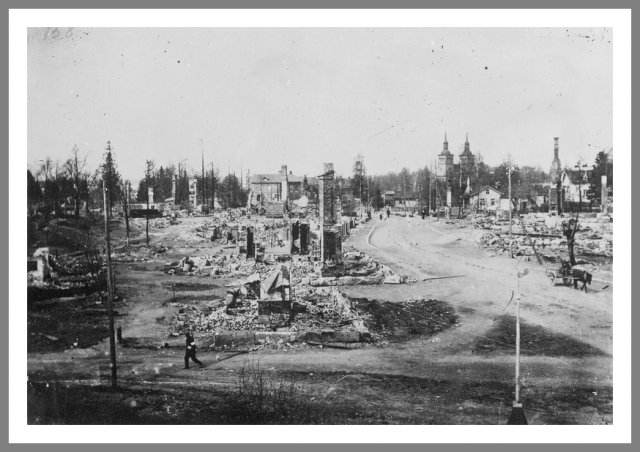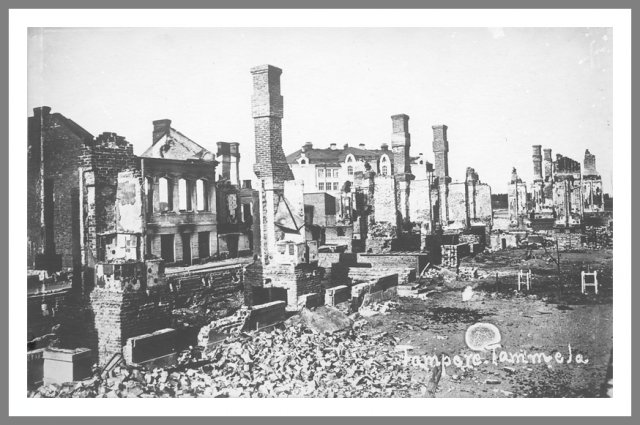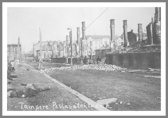 Tammerfors Tammerfors (Tampere) i ruiner. Slaget ved Tammerfors udkæmpedes mellem 16. marts og 6. april 1918. Antallet af døde var stort på begge sider. Desuden blev mange røde fanger henrettet. Slaget blev vundet af de hvide under C. G. E. Mannerheim, og befæstede krigens vendepunkt i de hvides favør. Ukendt fotograf © Krigsmuseet, Helsinki
