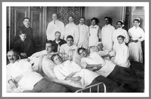 Hvidgardister på hospitalet Den danske løjtnant Borre-Larsen, der som frivillig på de hvides side blev såret under kampene om Tammerfors (Tampere), beskrev sit hospitalsophold således: "De var forskrækkeligt geskæftige, disse Røde Kors-Søstre, rent og fint og pillent skulde der være overalt, og vi, der kom lige fra Fronten, var nærmest gnavne over alt dette Væsen, skønt Gud skal vide, det var som at komme i Paradis denne Overgang fra Krig til Hospital." Her ses Civilgardister (hvide) som bliver behandlet på Røde Kors-hospitalet i Hatanpää. De røde behandlede generelt sårede civilgardister godt. Ukendt fotograf © Vapriikki Photo Archives, Tampere