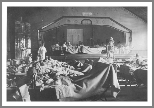 Hvidgardisternes hospital De mange sårede efter slaget ved Tammerfors (Tampere) blev oftest behandlet på hospitaler, som var knyttet til hver side. Her ses de hvides hospital. Ukendt fotograf © Krigsmuseet, Helsinki