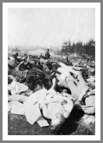 Faldne rødgardister "Som vi kom sydpaa, blev Kampsporene friskere og friskere, de døde laa nu spredt rundt langs Skinnerne og inde i Skoven, undertiden en hel Dynge, der overraskende var blevet angrebet af et skjult Maskingevær og mejet ned i flok." Således erindrede den danske frivillige på de hvides side, løjtnant C. Borre-Larsen i 1918. Her ses faldne røde soldater ved Tammerfors (Tampere). Ukendt fotograf © The Finnish Labour Museum Werstas, Tampere