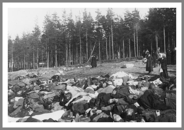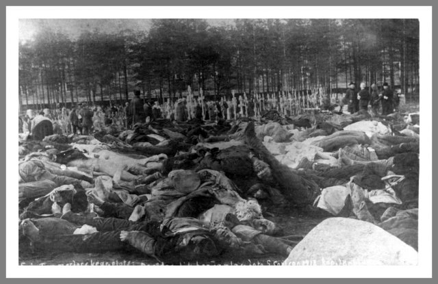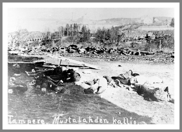 Faldne rødgardister Den følgende kommentar var foretaget under dette billede i et fotoalbum: "Manden til højre har intet hoved, den lille lyse cirkel er hans nakkeben. Ved tyskernes ankomst var han gået direkte til angreb på en tysk officer, som med ét velrettet slag afkortede hans højde såvel som hans liv." Ukendt fotograf © Krigsmuseet, Helsinki