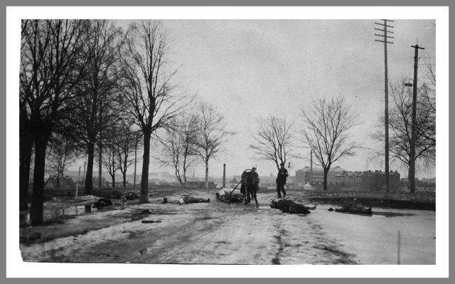 Faldne hvidgardister Tammerfors (Tampere) 5. april 1918 - én dag før de hvide endelig indtog byen. Læger samler ligene af faldne hvide krigsdeltagere fra vejsiden, nær ved hospitalet og kirkegården. Foto: Harald Natvig © Krigsmuseet, Helsinki