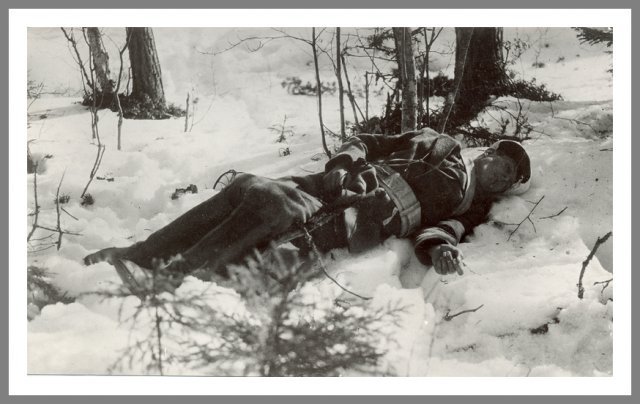 Falden hvidgardist En falden hvidgardist efterladt på slagmarken. Den danske frivillige på de hvides side, løjtnant C. Borre-Larsen beskrev i sine erindringer synet af de døde således: "Ved Lyly saa vi den første døde, en ganske ung Russer, der laa i en stor Blodpøl ude paa Isen ved Siden af Banelinien, skudt paa ganske nært Hold; hele Hovedet var knust og Hjernen flydt ud over Isen, de døde Øjne stirrede ligesom forundret paa os nyankomne". Foto: Harald Natvig © Krigsmuseet, Helsinki