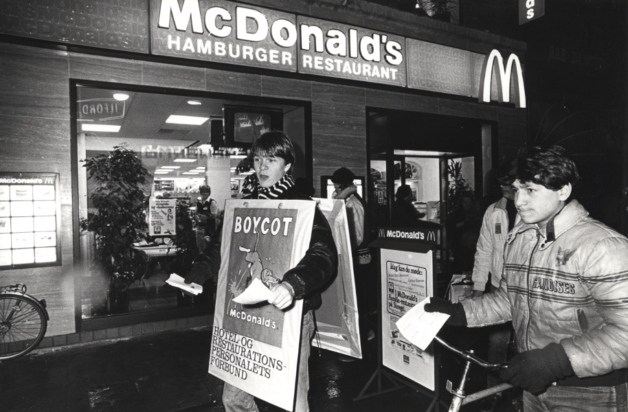 Slår man op under emnet 'Personalepolitik' på McDonalds hjemmeside, fremhæves det under overskriften 'Konkurrencedygtig løn og personalegoder', at virksomheden "følger fagforeningen 3F's overenskomst og fastlægger løn- og arbejdsvilkår ud fra den". Men sådan har det ikke altid været. Da McDonalds kom til Danmark søgte man - i modsætning til konkurrenten BurgerKing - at knæsætte en ideologisk betinget fagforeningsfjendsk grundholdning. Faglig Ungdom i København og Lærlingenes Landsorganisation (LLO) tog allerede i 1982 beslutning om at iværksætte en aktion mod McDonalds for at få dem til af følge den danske model på arbejdsmarkedet. Pressen stod i første omgang på virksomhedens side og der var generelt begrænset tiltro til at Faglig Ungdom og LLO ville have succes med deres forehavende. McDonalds fik en række ansatte til at skrive til LLO for at få dem til at opgive deres kampagne. Det viste sig, at kampen om overenskomstforholdene hos McDonalds skulle blive særdeles langvarig.