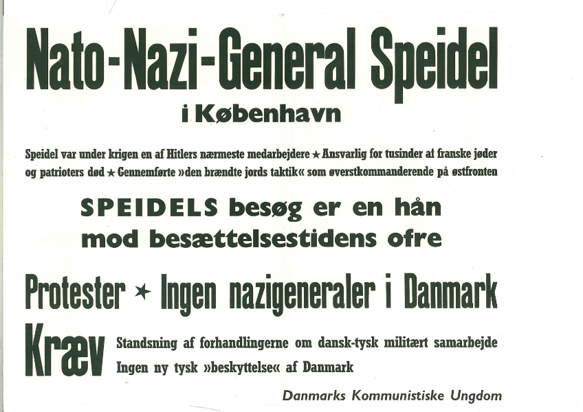 En række højtstående NATO-officerer var inviteret på officielt besøg til Danmark og startede i København, hvor de skulle forhandle med forsvarsstyrelsen. Herefter ville turen fortsætte til NATOs hovedkvarter i Oslo, og på hjemvejen var planlagt et besøg hos Den danske Kommando i Holsten. Spørgsmål som en evt. ændring af grænsen mellem NATO's nord- og centralregion og et forestående dansk-tysk flådesamarbejde var led i drøftelserne. Blandt disse officerer var én bestemt, hvis visit bragte sindene i kog og blev betragtet som en hån mod danske modstandsfolk, nemlig den tidligere tyske general Hans Speidel. Fra socialdemokratisk side var der sagt god for ham, for han blev aldrig nazist, havde reddet Paris fra ødelæggelse, været impliceret i sammensværgelsen mod Hitler og var selv blev fængslet. Men kommunisterne så noget anderledes på det, og protesterne mod Speidels besøg var startet flere dage i forvejen. I nætternes løb var plakater ulovligt sat op på gader og jernbanebroer, mens plankeværker og husmure var blevet overmalet med opråb. Ifølge politivedtægten måtte der kun opklæbes plakater på plakatsøjler, og politiet havde af den grund kunne anholde et par unge. Nogen dom blev det nok aldrig til, for Danmarks Kommunistiske Ungdom, som havde udgivet plakaterne, henholdt sig til, at opklæberne havde fået de rette instrukser. At Hans Speidel netop skulle overnatte på hotel d’Angleterre, som under besættelsen var blevet beslaglagt af værnemagten og havde huset adskillige tyske officerer, har måske været medvirkende årsag til den opfindsomme demonstration på taget. Mens alt dette skete var han selv til middagsselskab hos forsvarschefen på kasernen i Jægerborg, og skulle efter sigende først have hørt om det næste morgen! Kilder: Politiken, Land & Folk samt en række uidentificerede avisudklip fra dagene omkring begivenheden